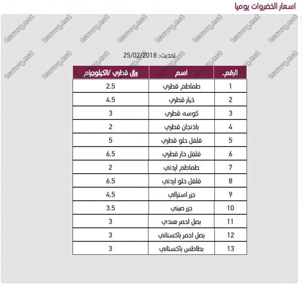 Fish,Veg,Fruit Prices 25 Feb 2018 Qatar M of E & C Get link Facebook X Pinterest Email Other Apps February 25, 2018 أسعار السمك الخضر الفاكهه 25-2-2018 قطر وزارة الاقتصاد والتجارة إضغط على الصورة لمشاهدة العرض كاملاُ Get link Facebook X Pinterest Email Other Apps Comments