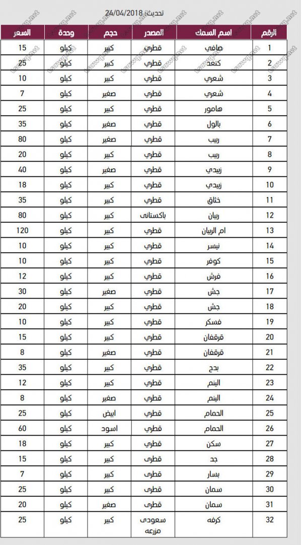 Fish,Veg,Fruit Prices 24 Apr 2018 Qatar M of E & C Get link Facebook X Pinterest Email Other Apps April 24, 2018 أسعار السمك الخضر الفاكهه 24-4-2018 قطر وزارة الاقتصاد والتجارة إضغط على الصورة لمشاهدة العرض كاملاُ Get link Facebook X Pinterest Email Other Apps Comments